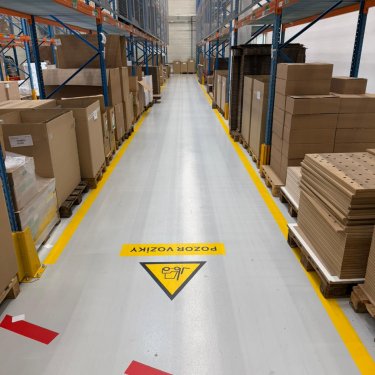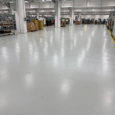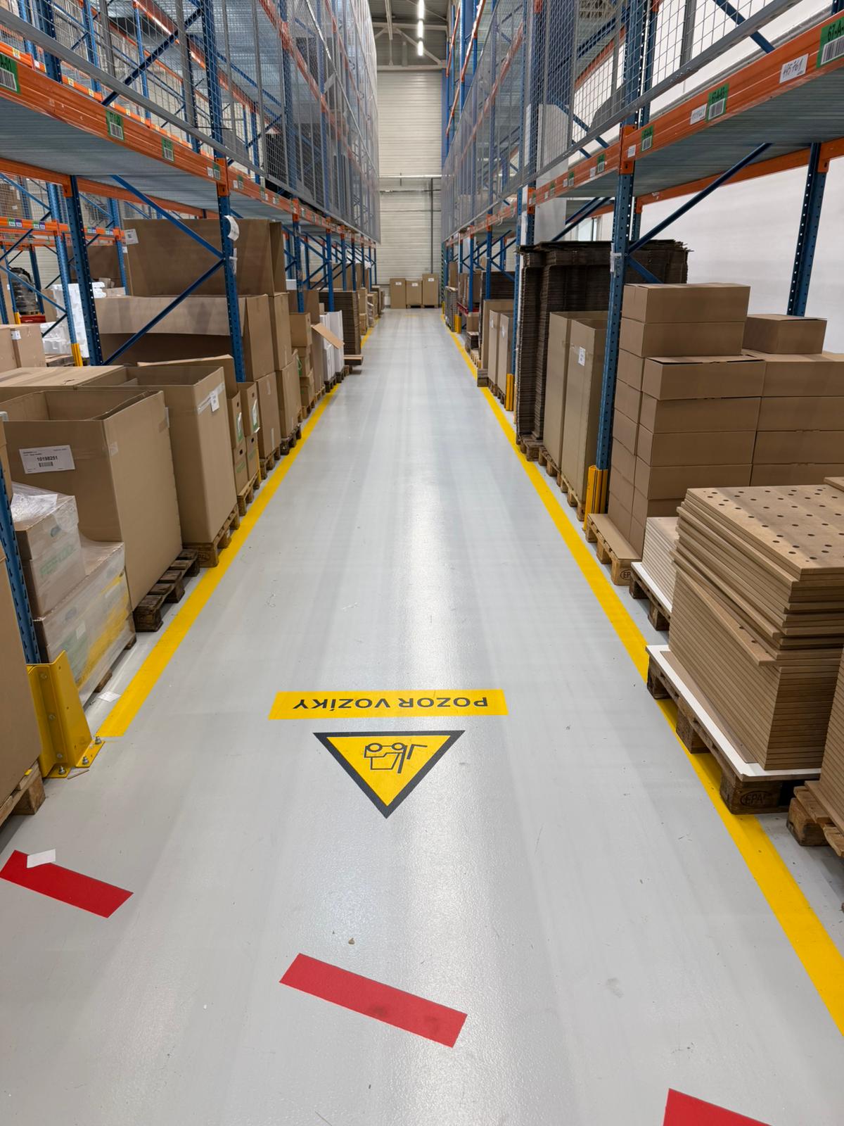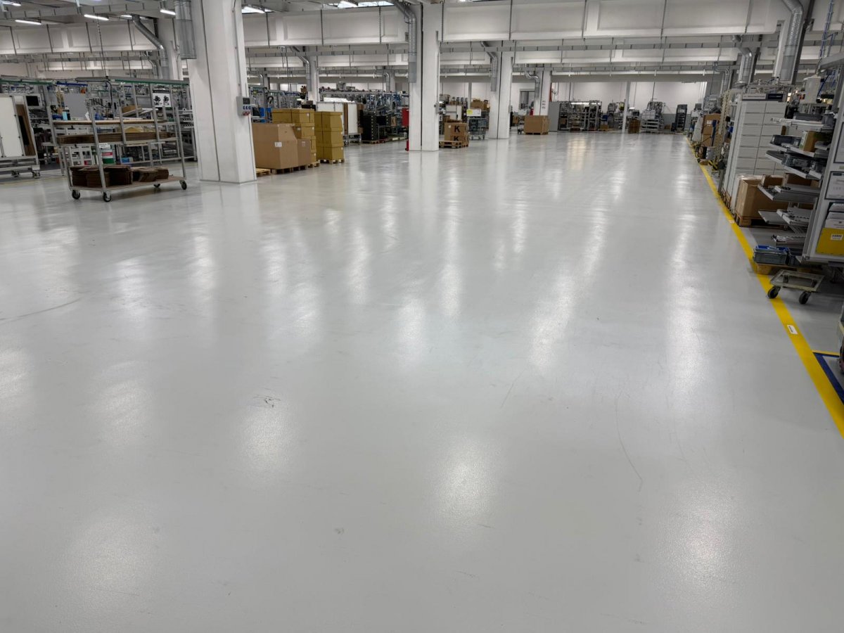 V této realizaci jsme provedli rekonstrukci drátkobetonové podlahy dobré kvality. Požadavkem investora bylo sjednocení barevnosti a povrchů podlah s vedlejší montážní halou a zlepšení vlastností podlahy. V původní podlaze byly zabudovány kolejnice od pojízdných paletových regálů, které bylo nutné vybourat. V realizaci byl použit systém IQ floor ScT tl. 1-2mm, který bezpečně odolává střední zátěži a pojezdu VZV. Dalším benefitem je nenasákavost a umyvatelnost nového povrchu, což původní podlaha nesplňovala.