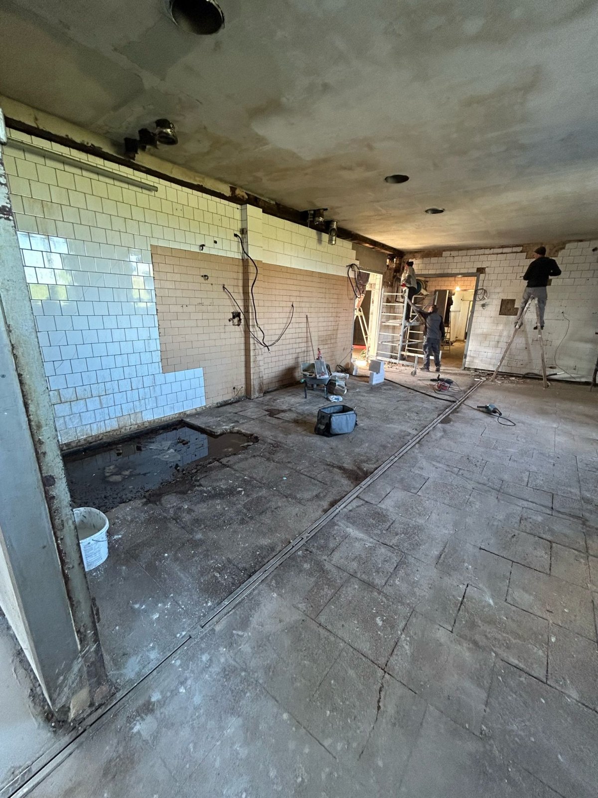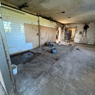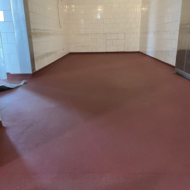 V této referenční realizaci jsme provedli rekonstrukci staré podlahy v menší lokální masné výrobě. Původní podlaha se skládala ze stropní konstrukce a chemicky/teplotně odolné dlažby, staré téměř 20 roků. Většina dlažby byla přídržná k podkladu, z tohoto a hlavně z časového důvodu, bylo rozhodnuto, že bude vybourána pouze nepřídržná dlažba a zbytek bude povrstven. Z velkého časového tlaku na realizaci se taktéž musely zachovat stávající odvodňovací nerezové prvky.